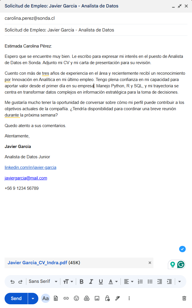 Inicia el correo con un saludo profesional y un breve párrafo introductorio. Adjunta la carta de presentación y el CV en formato PDF. Menciona claramente en el cuerpo del correo que estás incluyendo también una carta de presentación con mayores detalles sobre tu historial profesional.
