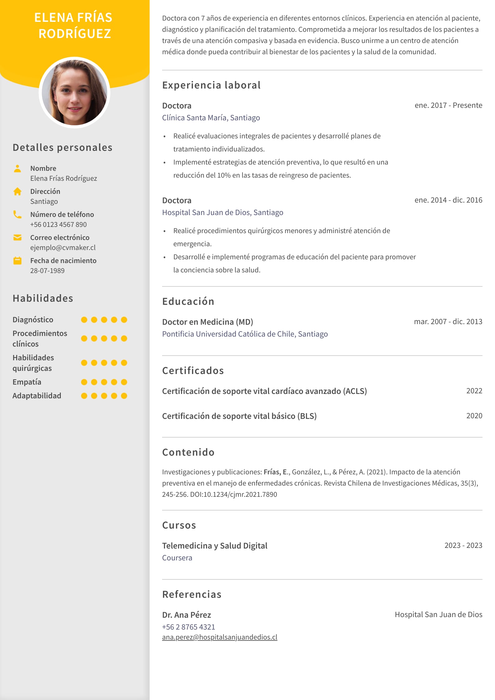 Dentro de nuestro apartado de ejemplos de currículum vitae, el equipo de CVMaker acaba de crear un currículum vitae de un doctor donde se refleja todo lo que explicaremos a continuación. Te recomendamos que le eches un vistazo antes de continuar leyendo para que tengas una idea de lo que esperan ver los equipos de Recursos Humanos y comiences a tener una idea general más precisa de cómo debería verse tu documento, pero teniendo en cuenta tus propias características individuales.